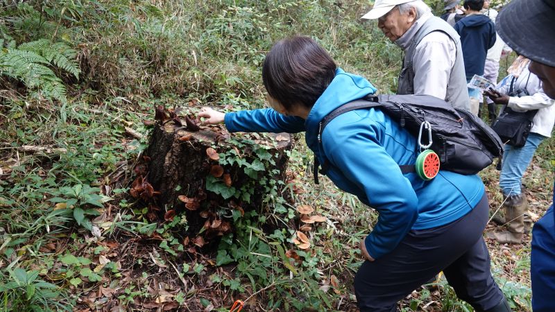 セイタカアワダチソウが黄色い花を咲かせ始め、 谷津田もようやく秋らしい風情になりました。森の中はにぎやかで、植物のパワーに圧倒されるようです。木の幹や、落ちた枝、または地面から多種多様なキノコが生えています。「これ食べられるかな?」と聞くと「そればっかり聞くよね?」と嫌がられています。アズマネザサは切っても切っても生えてきます。チヂミザサは今が盛りでしょうか?ねばねばする花穂をたくさんつけています。タケニグサは果実をつけ、クワはそこここにはびこっています。フユイチゴが実をつけ始め、ヤマイモのムカゴが垂れ下がってきました。散策路を少しでも整備しようと、植物を刈りこみ枝や蔓を取り除きました。作業をすると汗が噴き出てきましたが、森を渡る風は爽やかです。 報告 高橋久美子