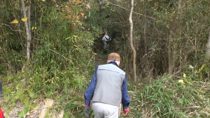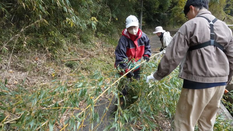 この日は復田している田んぼの正面にある森の手入れを行いました。マダケを切り倒して運び出し、充分に太く強度のあるものは枝を落としておだ小屋に収めました。マダケを切ったあと、刈払い機で周辺のアズマネザサ・アオキを伐採したら、人が休むのにちょうど良さそうな明るい空間が生まれました。 午後は、森にある材料を使ってリースづくりをしました。 参加者11名(大人8名、大学生1名、中学生1名、小学生1名) 報告:鈴木郁也