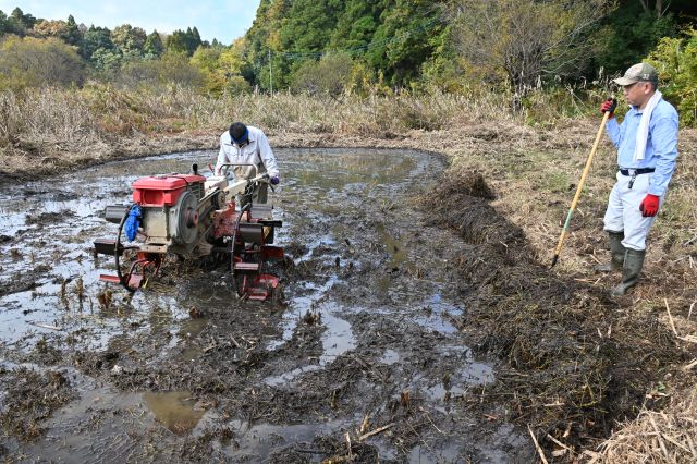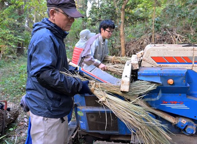 谷津田は紅葉が美しい季節になりました。雲の多い日でしたが、青空に緑・黄・赤の色合いが映え、見る目を楽しませてくれました。 前回のマイ田んぼの復田作業は、植物に覆われていたのを刈払機で刈りました。そしてこの日は田んぼに戻す作業、つまり水を入れて耕す作業です。しかしこれが大変な作業でした。地中にはヨシやガマ、ムツエオレグサ、ミゾソバ等の根がしっかり残っています。根は深く、隅々まで入りこんでいます。これを除去又は粉砕する必要がありますが、我々の力では到底無理なので農家の方に助っ人をお願いしました。耕運機による作業です。 しかしすぐ耕運機が入れるのではなく、まだ残っていた表面の寝ている草や、刈り取った草の除去を全員が人力で行いました。特に厄介だったのはムツオレグサで、厚く、固く、広く、根も張っているため複数人が協力しての除去でした。まるで厚いカーペットを地面から引きはがし、クルクル巻いていくようなやり方で、大変労力を使いました。 耕運機も最初は草や根が多く、深く耕せません。同じ場所を何度も何度も繰り返し回り、少しずつ深く耕すのです。午前中で終わらせる予定でしたが、甘かったようで、午後も作業を続けました。2枚の田んぼを耕しましたが、まだ完成に至りません。あと何回か、同じように耕運機を回す必要があります。 午後からは並行して、今年収穫されたお米(古代米)の脱穀作業をしました。脱穀機は順調に動いてくれました。山の手入れではオニグルミの種を植えました。草刈りもしました。 報告; 平沼勝男