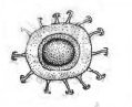 淡水産のコケムシは群体内に1mmほどの休芽を持っています。晩秋になり、寒さのため群体が死滅すると、休芽は池の中に放出され、そのまま冬を越します。春 になり再び水温が上昇すると休芽が発芽し、コケムシの小さな群体が生まれ、秋には大きな群体へと成長します。図2はオオマリコケムシの休芽で、平らで周囲にいかり状のとげが十数本あります。このとげは軟らかく藻などにからみつきやすくなっています。