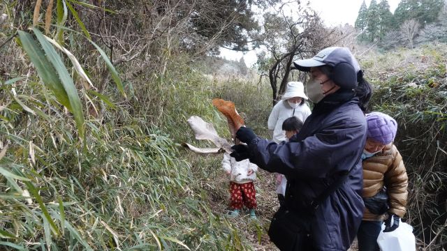 1月は生きものたちにとって命の危機にさらされる季節でしょう。草花の多くは地上部を落とし、種や地下部を残して冬を乗り切ります。昆虫たちは卵を残したり、土や木の中に潜んだりしてやり過ごしたりします。淋しい季節かと思いきや、この時期にだけ観られる生きものがいます。アオジやカシラダカ、ツグミなど冬鳥と呼ばれる鳥たちです。シジュウカラやエナガ、メジロなどの小鳥たちが「混群」を作ってにぎやかに現れるのもこの季節です。 今日は冬鳥を求めて、鹿島川合流部まで真冬の谷津を散策しました。強風が吹き荒れていた影響か、アオジやカシラダカがちらほら姿を見せる程度で、期待したほどではありませんでした。それでも参加者たちは、カラスノエンドウのサツマイモやカボチャのような塊茎を見つけて興味津々。壊れそうな橋を渡ったり、水辺に張り出したフジヅルのブランコを楽しんだりと、ちょっとした探検気分で冬の谷津を満喫しました。 参加者18名(大人12名、大学生1名、高校生1名、小学生3名、幼児1名)