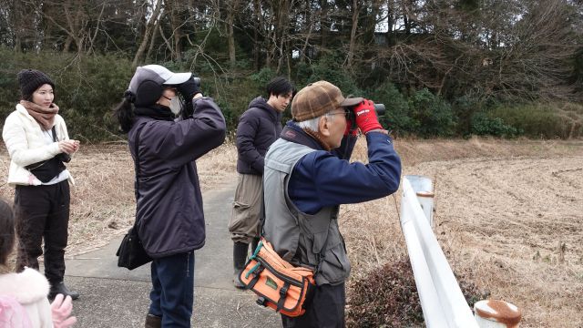 今回は300回目の観察会でした。2000年2月20日に第1回目の観察会を開催してから25年。一度も欠かさずに毎月実施できたのも、ここに生命をはぐくむ豊かな谷津田・里山があったからと感謝しています。昨年は開発問題に揺れたこの谷津田ですが、子どもたちに受け継いでいくためにはどうすればいいのか考え、実行していきたいと思います。 この日は、集合場所から鹿島川本流の合流点まで、野鳥を中心に観察していきました。歩き始めてすぐに上空を優雅に舞うノスリが出現。幸先の良いスタートでした。時々アオジやカシラダカが姿を見せましたが、いつになく野鳥の数が少ない状況でした。道沿いに張り出した木の枝が伐採されていたり、ピンク色のテープが張られたりしていたので開発のための目印かと心配しましたが、道路公団のコーンポストを見つけて、これが高速道路沿いの樹木の手入れのためだと分かりました。 藪こきをしながら1時間ほどで鹿島川本流に着き、来た道を引き返しました。最後にフユイチゴの実を味わい記念写真を撮影してこの日の観察会を終了しました。 確認した野鳥(順不同):キジ,キジバト,アオサギ,ノスリ,コゲラ,モズ,ハシボソガラス,ハシブトガラス,シジュウカラ,ヒヨドリ,ウグイス,エナガ,メジロ,シロハラ,ジョウビタキ,セグロセキレイ,カシラダカ,アオジ,ガビチョウ(19種). 参加者14名(大人11名、大学生1名、小学生2名、幼児1名)