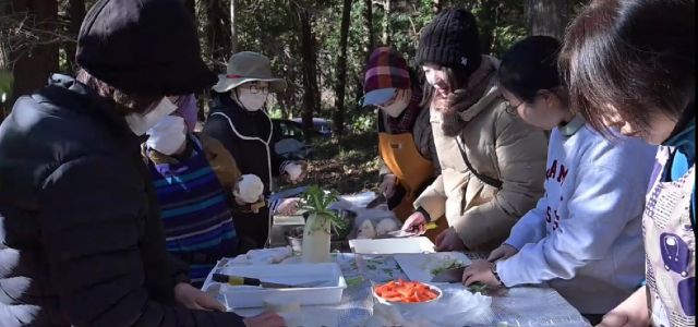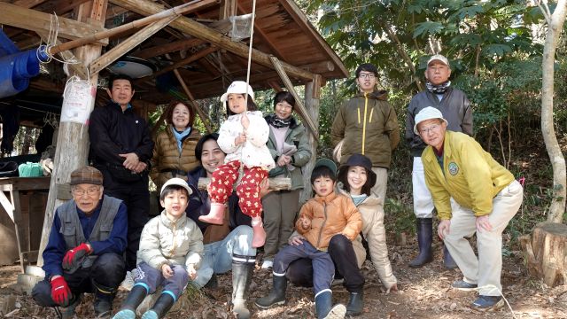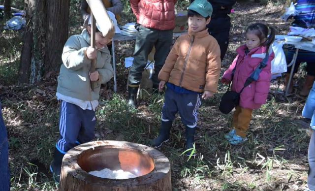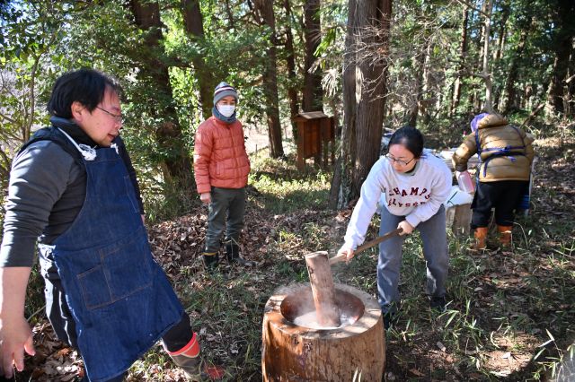 この日は餅つき大会を開催し、多くの参加者で森が賑わいました。寒い朝でしたが、大人は火を管理する人や鍋を用意する人などに分かれて準備に励みました。子どもたちはブランコで大はしゃぎ。その合間に料理を手伝ってくれた子もいました。 もち米は昨年復田した田んぼで収穫した古代米の緑米と黒米を4kg、さらに4弁にするために市販のもち米を2kg使いました。また、皆さんが持ち寄ったたくさんの野菜やアジ、サバ、ウルメイワシの干物、そして餅の具材が揃いました。お味噌汁と餅の準備が終了し、いよいよ餅つきが始まりました。 2升ずつ2回に分けて行い、経験者から子供までが掛け声とともに杵を振りました。ついた餅は醤油、きな粉、あんこ、大根おろし、そして納豆で食べました。お雑煮にするのも人気でした。つきたては柔らかくてとても美味しかったです。 片づけが終了すると、最後に記念写真を撮ってから解散しました。晴天の下での楽しい餅つき大会になりました。ご馳走さまでした。 参加者30名(大人18名、大学生1名、高校生1名、中学生2名、小学生6名、幼児2名)