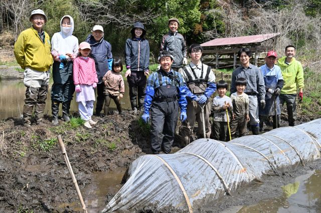 季節が戻ったように寒い日になりました。太陽が出ていないためかなお更そう感じます。そんな中でも元気に作業をしました。復田作業はこの日は3名。2人はいつもながらのアシの根との格闘です。スコップで横に伸びた根を切り、燃料ポンプの水圧で泥を飛ばして除去します。もう1人は畔作りをしました。畔ができるとがぜん田んぼらしくなります。今後、イノシシにやられてもいいように畔の上に板を敷きたいと考えています。復田した面積は予定した田んぼの3分の2にくらいになりました。今年のお米つくりはこの面積でも良いと思いました。最低ラインをクリアしたというところでしょうか。 もう一方の作業として森の手入れをしました。不要な草木の除去です。作業後はすっきりした良い森になりました。倒したコナラがあるので、その木を利用してシイタケ栽培をする予定です。そのための榾木(ほだぎ)作りも始めました。しかしチェンソーの調子が悪く、次の機会に持ち越しとなりました。 田んぼにはアカガエルの卵塊が増えていました。この数日で20個以上増えました。それでも今年はどういうわけか壊滅的に数が少ないです。水環境を守るため畔の補修をし、田んぼに水を入れました。これからも水が枯れることがないように、大事にアカガエル達を守っていきます。 報告;平沼勝男 参加者7名(大人5名、大学生2名)