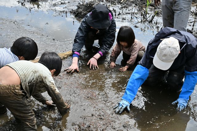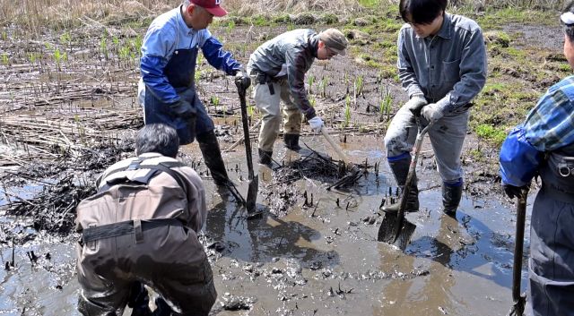 週間天気予報ではこの日から厳しい寒さになるとの予報でした。しかし当日は日が照り、風もなく、作業をするとうっすら汗をかく程度。ちょうど良い天気と言えたでしょう。この日の作業は3回目となる復田です。前回ポンプを持って行かないという失態の反省から、この日はポンプが大活躍することとなりました。アシの地下茎の除去がテーマなのでポンプの水圧を地下茎にぶつけ泥を飛ばし、取り出します。レンコンの収穫方法と同じです。しかし実際にはそう簡単ではありませんでした。まず泥が深い。膝上まである丈の長い水田用の長靴を履いていても、泥水は長靴の中に入ってきました。長靴が泥から抜けなくなるスタッフもいました。地下茎が深いところでつながっていることが度々あり、都度スコップで分断ました。泥深い中でこの作業は重労働でした。しかし作業を続けることで、だんだんと田んぼらしい状態になってくるのが分かるので、その点は楽しかったです。何より気心の知った仲間とする作業は良いですね。 報告 平沼勝男 午前中は復田作業を行いました。膝上まで泥で埋まりながら、肘の上まで泥の中に腕を突っ込んでアシの根を探して引っこ抜くサ票を繰り返しました。作業を始めたばかりの時は気温も低く、泥が冷たくてすっかり体が冷えきる思いでしたが、正午に近づくにつれて日差しが出て暖かくなり、救われました。午後は森の手入れで、観察路の一画のアズマネザサを刈り、点在するように生えていた木本も切りました。小さな広場のような空間が出来上がり、作業終了後に記念撮影をしました。 報告 鈴木郁也 参加者7名(大人6名、大学生1名)