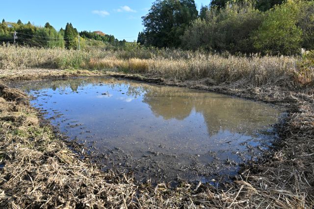 朝から冷たい小雨の中、6人が集まりニホンアカガエルの卵塊調査をしました。例年2月の観察会は、ニホンアカガエルの卵塊調査をメインテーマに実施してきました。今年は今までとは大きく環境が変化しています。それは開発問題が具体的に動き出したため、昨年は米づくりができずに田んぼが荒れ放題となってしまったことです。夏は雑草で覆われてしまい、わずかに水面が見えるくらいの谷津田が広がっていました。今の季節は植物も枯れて、水面が広く見られる場所もありますが、果たしてニホンアカガエルは産卵してくれているでしょうか。 YPP田んぼ、マイ田んぼ、復田している田んぼ、下流部の鉄塔下の水辺を丹念に観て歩きましたが、ニホンアカガエルの卵塊を見つけることができませんでした。少雨など季節的なものなのか開発の影響なのかははっきりしませんが、調査を継続していこうと思います。 参加者5名(大人4名、大学生1名)