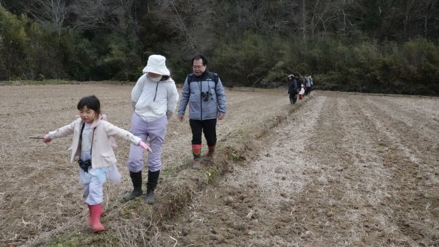 朝から冷たい小雨の中、6人が集まりニホンアカガエルの卵塊調査をしました。例年2月の観察会は、ニホンアカガエルの卵塊調査をメインテーマに実施してきました。今年は今までとは大きく環境が変化しています。それは開発問題が具体的に動き出したため、昨年は米づくりができずに田んぼが荒れ放題となってしまったことです。夏は雑草で覆われてしまい、わずかに水面が見えるくらいの谷津田が広がっていました。今の季節は植物も枯れて、水面が広く見られる場所もありますが、果たしてニホンアカガエルは産卵してくれているでしょうか。 YPP田んぼ、マイ田んぼ、復田している田んぼ、下流部の鉄塔下の水辺を丹念に観て歩きましたが、ニホンアカガエルの卵塊を見つけることができませんでした。少雨など季節的なものなのか開発の影響なのかははっきりしませんが、調査を継続していこうと思います。 参加者5名(大人4名、大学生1名)