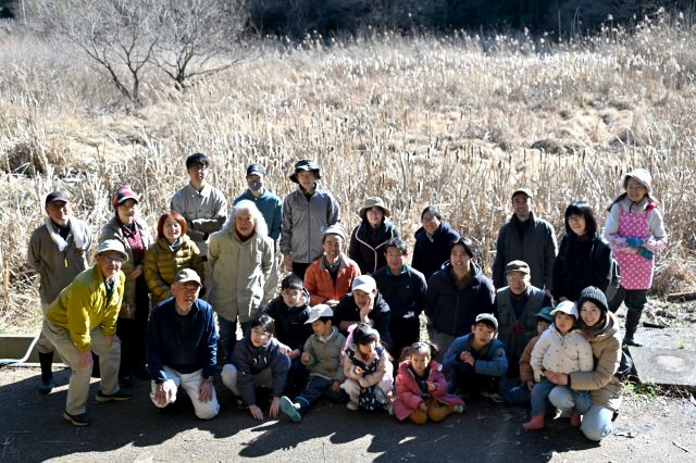 週間天気予報ではこの日から厳しい寒さになるとの予報でした。しかし当日は日が照り、風もなく、作業をするとうっすら汗をかく程度。ちょうど良い天気と言えたでしょう。この日の作業は3回目となる復田です。前回ポンプを持って行かないという失態の反省から、この日はポンプが大活躍することとなりました。アシの地下茎の除去がテーマなのでポンプの水圧を地下茎にぶつけ泥を飛ばし、取り出します。レンコンの収穫方法と同じです。しかし実際にはそう簡単ではありませんでした。まず泥が深い。膝上まである丈の長い水田用の長靴を履いていても、泥水は長靴の中に入ってきました。長靴が泥から抜けなくなるスタッフもいました。地下茎が深いところでつながっていることが度々あり、都度スコップで分断ました。泥深い中でこの作業は重労働でした。しかし作業を続けることで、だんだんと田んぼらしい状態になってくるのが分かるので、その点は楽しかったです。何より気心の知った仲間とする作業は良いですね。 報告 平沼勝男 午前中は復田作業を行いました。膝上まで泥で埋まりながら、肘の上まで泥の中に腕を突っ込んでアシの根を探して引っこ抜くサ票を繰り返しました。作業を始めたばかりの時は気温も低く、泥が冷たくてすっかり体が冷えきる思いでしたが、正午に近づくにつれて日差しが出て暖かくなり、救われました。午後は森の手入れで、観察路の一画のアズマネザサを刈り、点在するように生えていた木本も切りました。小さな広場のような空間が出来上がり、作業終了後に記念撮影をしました。 報告 鈴木郁也 参加者7名(大人6名、大学生1名)