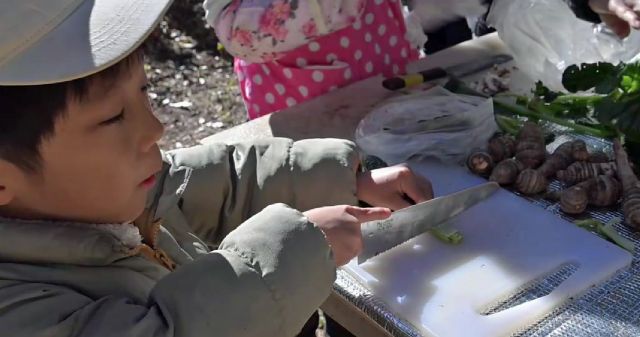 雨のため1日順延で開催となりましたが、前日の雨は2つの恵みをもたらしてくれました。1つは乾燥状態ではなくなったこと。連日のニュースで山火事のことが報じられていましたのでひと安心でした。もう1つはシイタケ、数年前に菌を植えつけた榾木にたくさんの大きなシイタケが付いていました。肉厚でおいしいシイタケでした。 この日は少人数ながら大学生の割合が多く、とても活気がある会になりました。スタッフからの説明の後、谷津田を歩き野草を採集。この日採れた山菜はセリ、スイバ、タネツケバナ、ギシギシ、ニワトコ、ヨモギ、ノビル、ツクシ、ドクダミ、セイタカアワダチソウなどです。これらを種類ごとに仕分けして洗浄、そして調理です。 野草たっぷりのお味噌汁に始まり、各種野草の天ぷら、セリのおひたし、ツクシの炒め物、シイタケの網焼き、どれも美味しかったです。若い人たちも楽しんでいる様子でした。 参加者15名(大人10名、大学生4名、中学生1名) 報告:平沼勝男