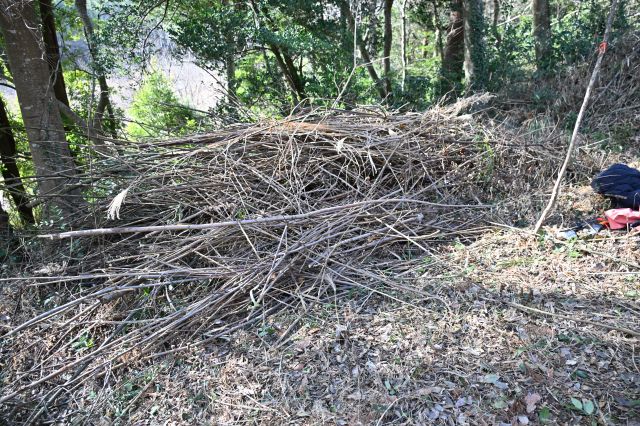 この日は復田している田んぼの正面にある森の手入れを行いました。マダケを切り倒して運び出し、充分に太く強度のあるものは枝を落としておだ小屋に収めました。マダケを切ったあと、刈払い機で周辺のアズマネザサ・アオキを伐採したら、人が休むのにちょうど良さそうな明るい空間が生まれました。 午後は、森にある材料を使ってリースづくりをしました。 参加者11名(大人8名、大学生1名、中学生1名、小学生1名) 報告:鈴木郁也