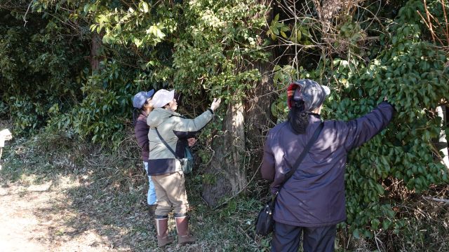 この日は淡い空色がきれいな冬晴れの日でした。冬枯れのおかげで、先月に比べれば歩きやすい道が多くなりましたが、調子に乗って奥へ奥へとと藪漕ぎをすると、ノイバラの群落に突っ込んでしまいました。開けた場所では双眼鏡を構えて野鳥を探しました。この日はあまり鳥の姿が見られず、唯一印象深かったのがカラスがオオタカを追いかけていた場面でした。例年ヒラタケが生える木が倒れてしまっていましたが、少数ながら今年も生えてくれていて、観察会終了後に参加者で山分けして持ち帰りました。 参加者15名(大人10名、大学生2名、小学生2名、幼児1名) 報告:鈴木郁也